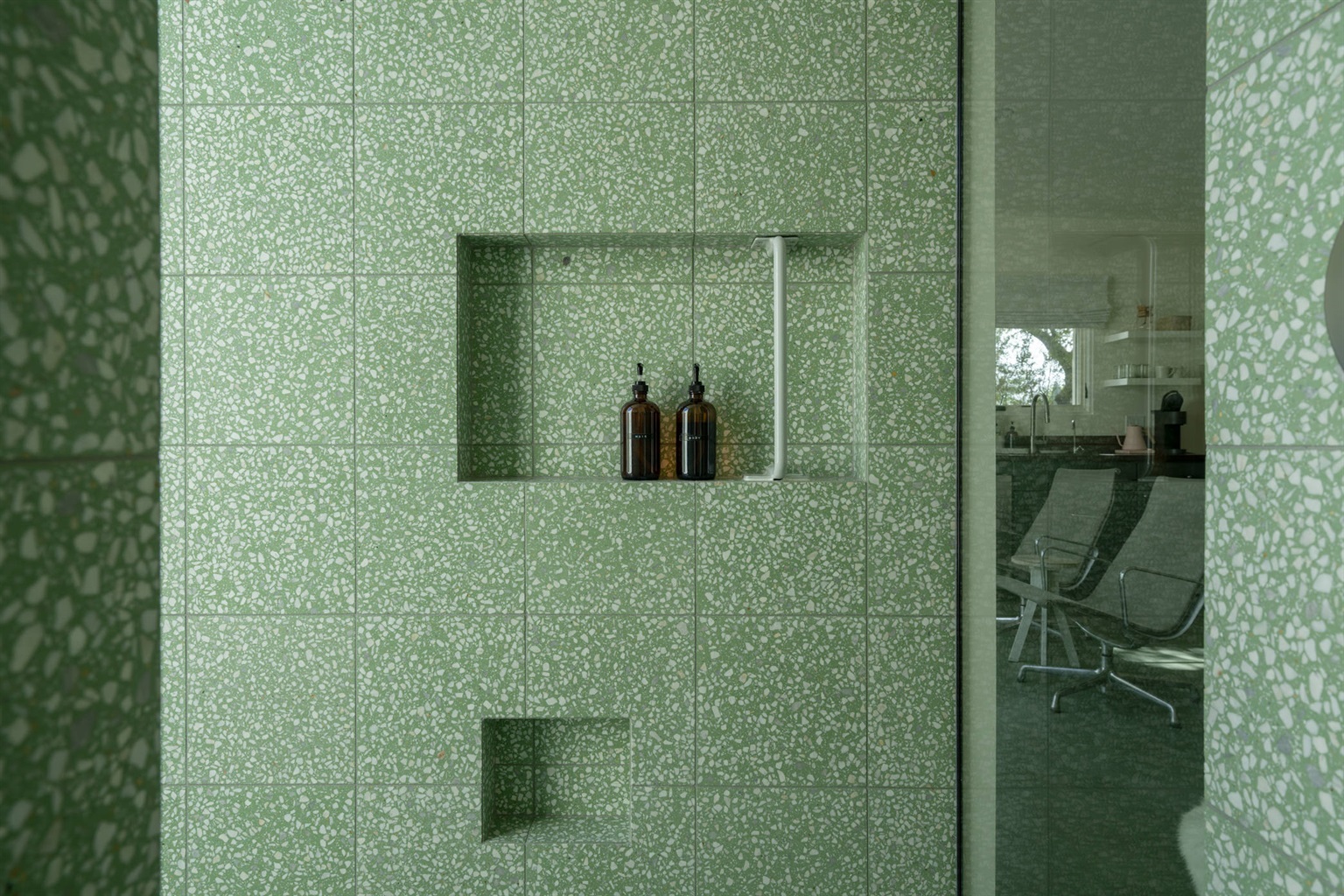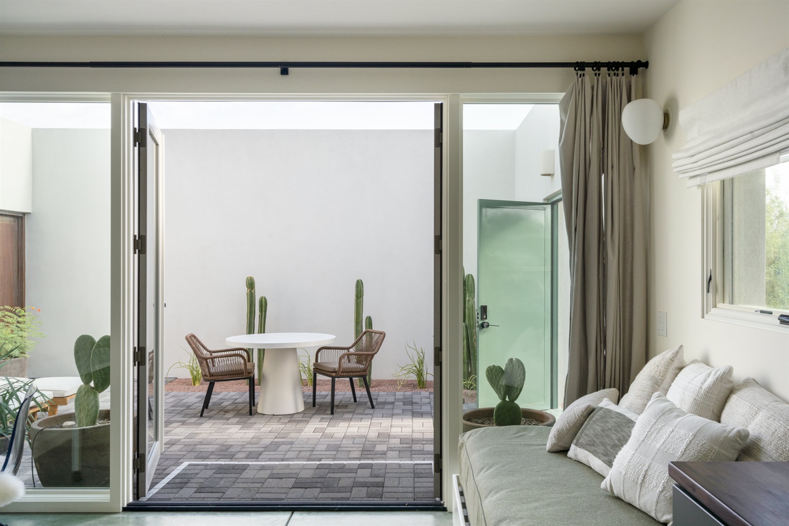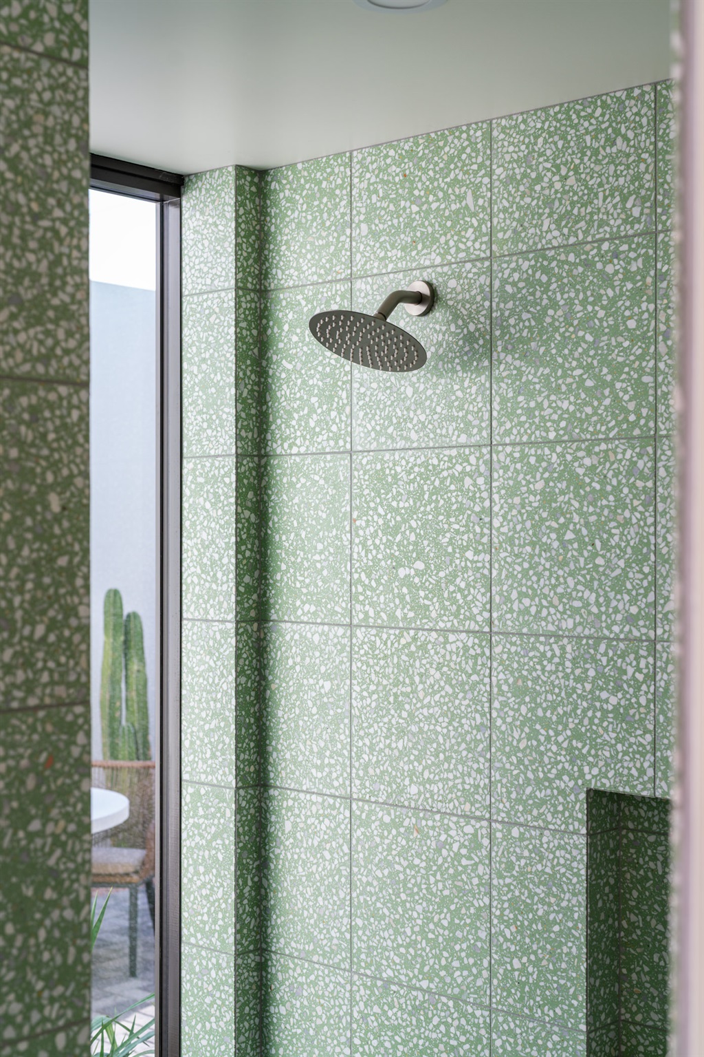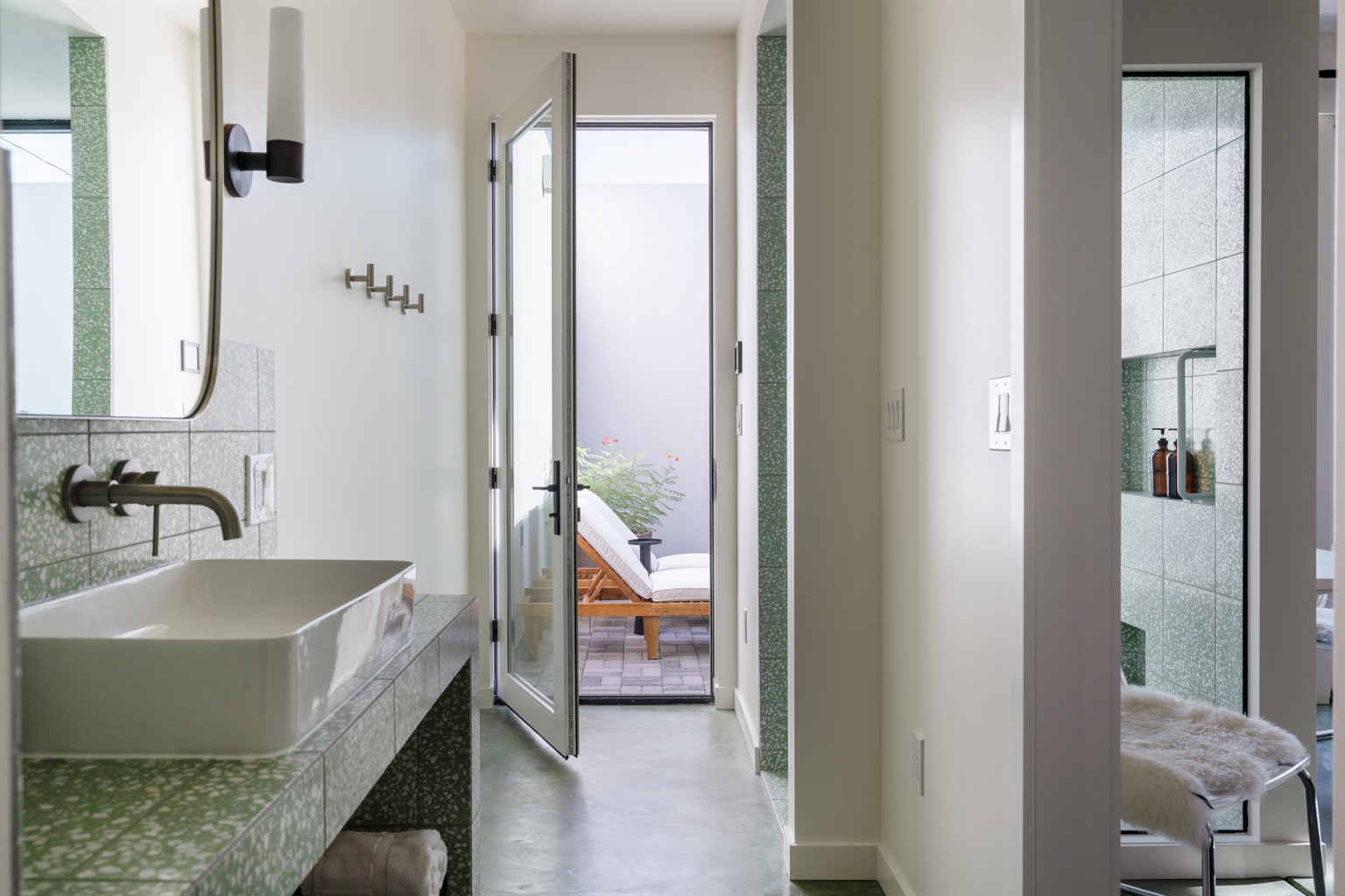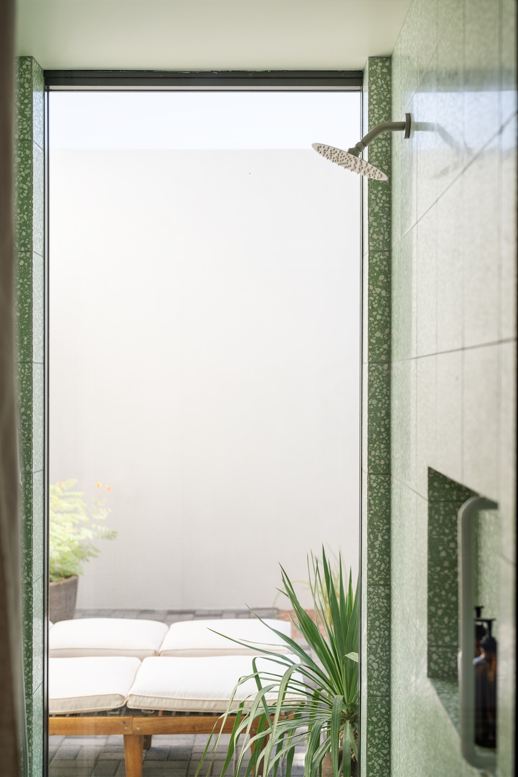 Inside, you'll find a soothing palette of sage green, white, and natural wood tones. Large glass bifold doors open to a spacious, high-walled patio, seamlessly blending the indoor and outdoor living areas. The spa-like bathroom features a unique view shower with distinctive green terrazzo-style tile.