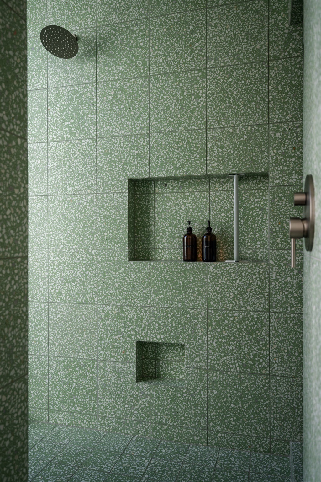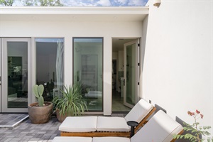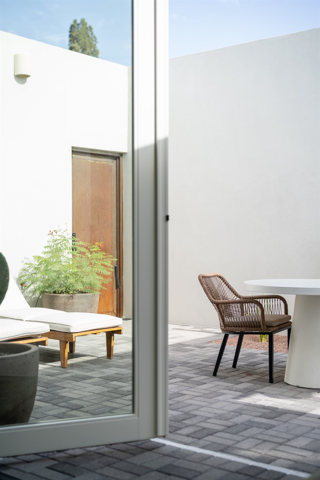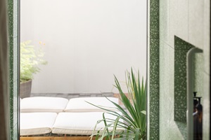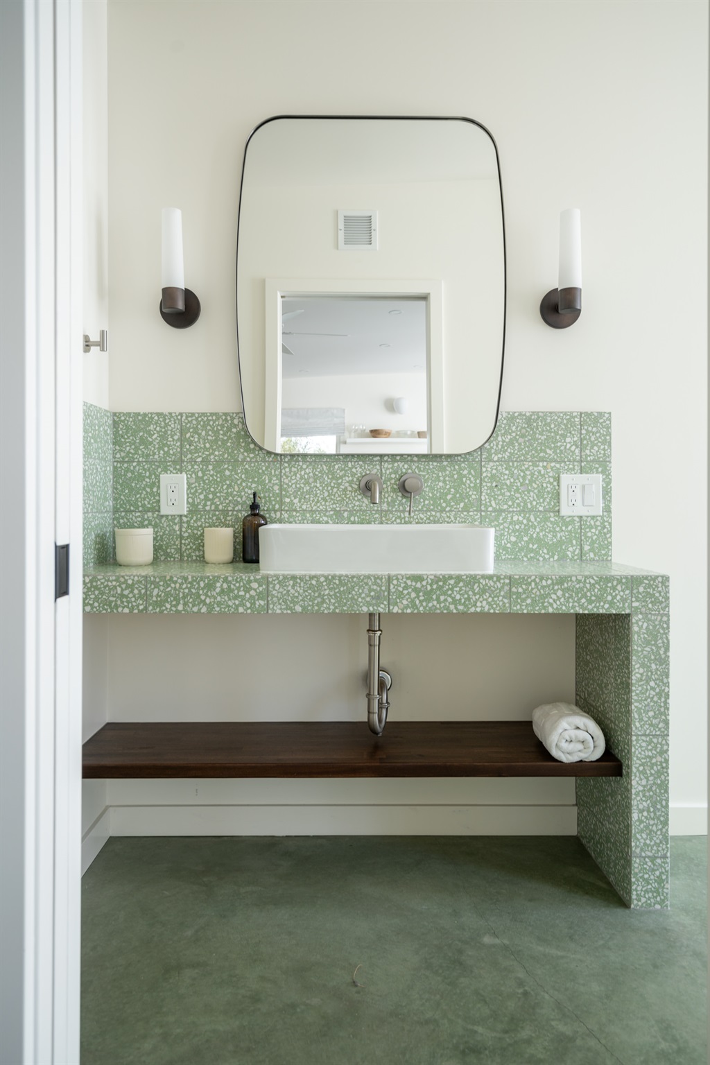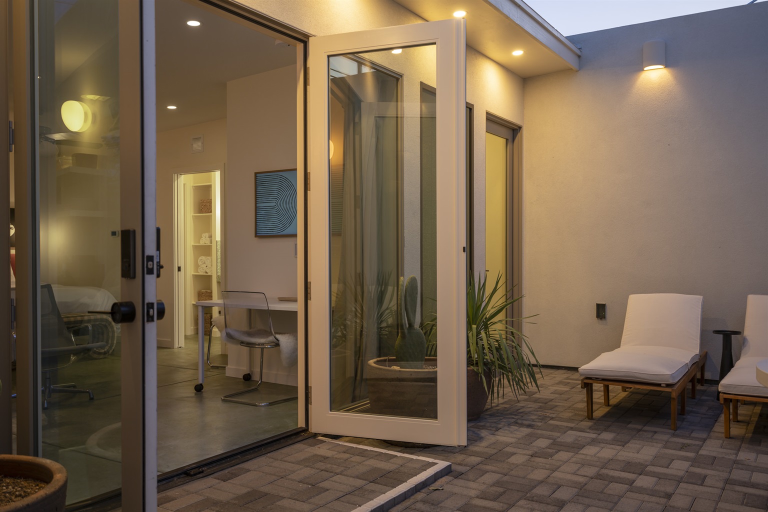 Inside, you'll find a soothing palette of sage green, white, and natural wood tones. Large glass bifold doors open to a spacious, high-walled patio, seamlessly blending the indoor and outdoor living areas. The spa-like bathroom features a unique view shower with distinctive green terrazzo-style tile.