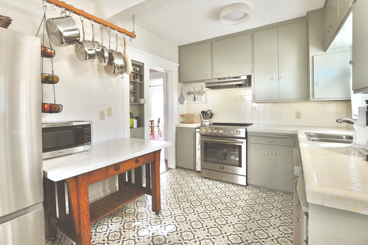In the kitchen, you'll find a Keurig coffeemaker -- with a few pods to get you started -- as well as pots and pans, chef's knives, an induction range and electric oven, a microwave, toaster and blender as well as a refrigerator/freezer.